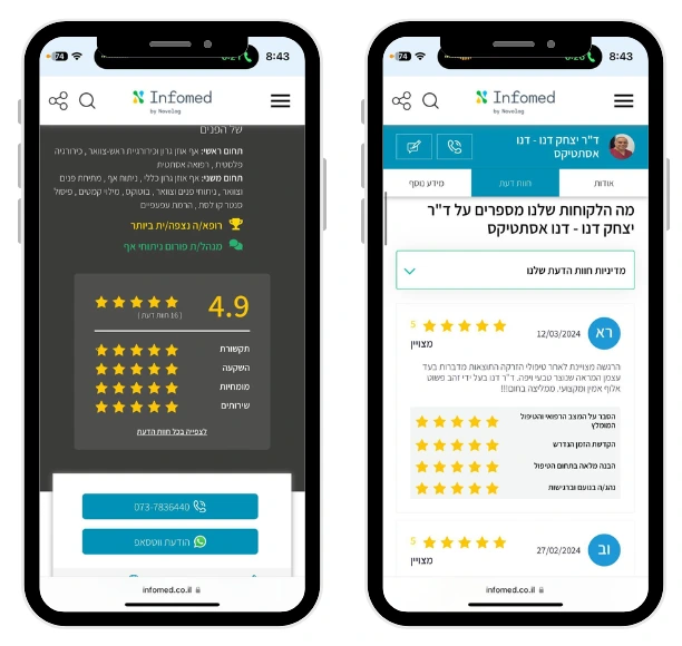 אינדקס הרופאים השלם של Infomed מאגד בתוכו מגוון רחב של רופאים ורופאות בתחומי מומחיות שונים, מיועד לשימוש הקהל הרחב ומתפרסם גם באתר Ynet . עמודי המומחים מכילים את כל המידע הרלוונטי ופרטי הקשר שיאפשרו למטופלים הפוטנציאליים להתרשם מניסיונך המקצועי ולקבוע תורים בקלות.